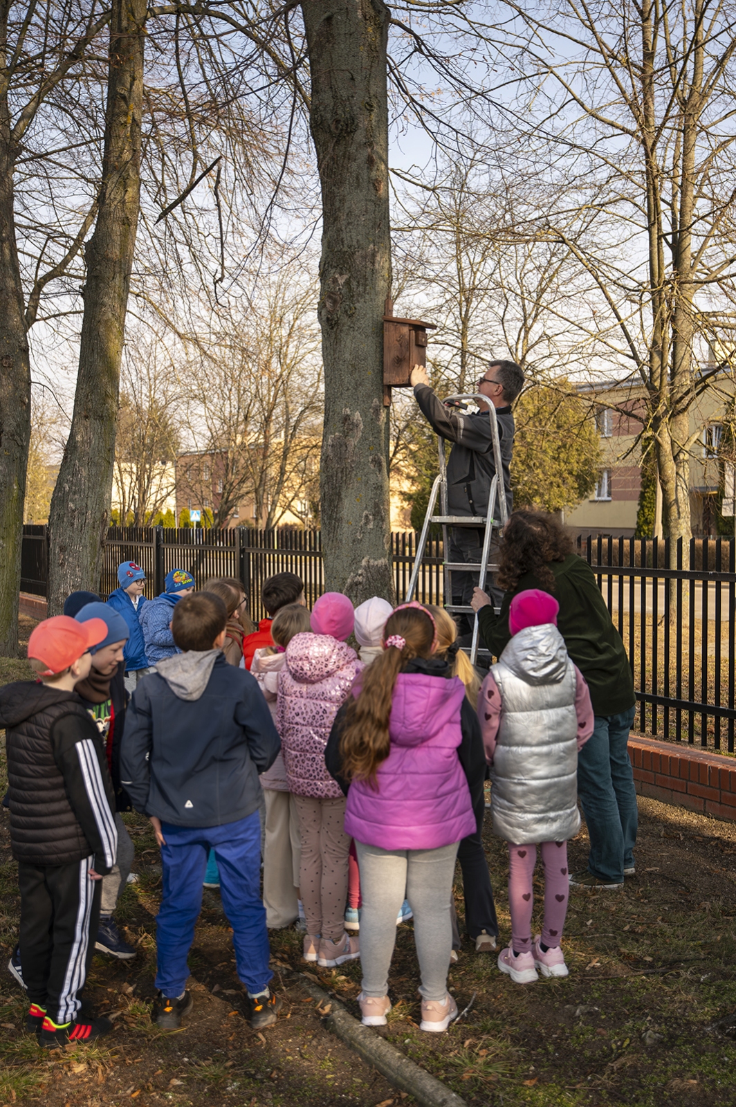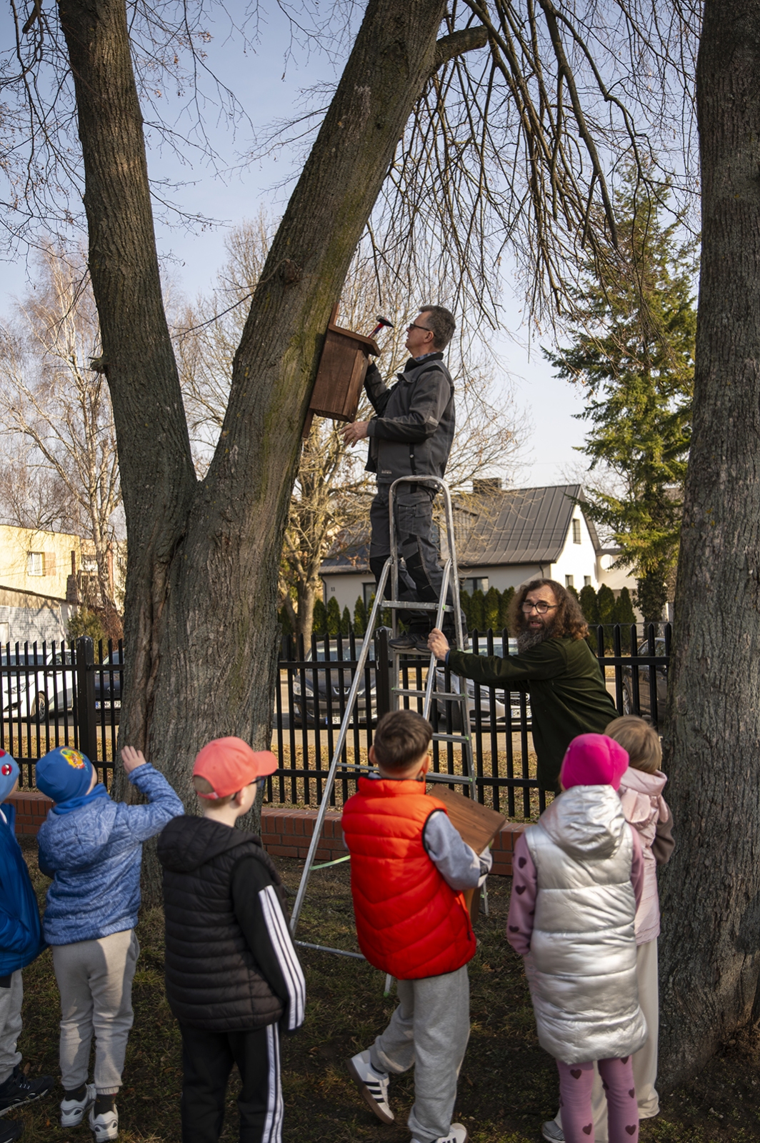 Wiedza teoretyczna płynnie przeszła w działania praktyczne. W drugiej części spotkania cała pierwsza klasa, pod czujnym okiem wychowawczyni, pana Piotra oraz szkolnego konserwatora, udała się na teren przylegający do szkoły. Wspólnymi siłami zawieszono przygotowane budki na drzewach, tworząc bezpieczne przestrzenie dla lokalnych populacji ptaków.