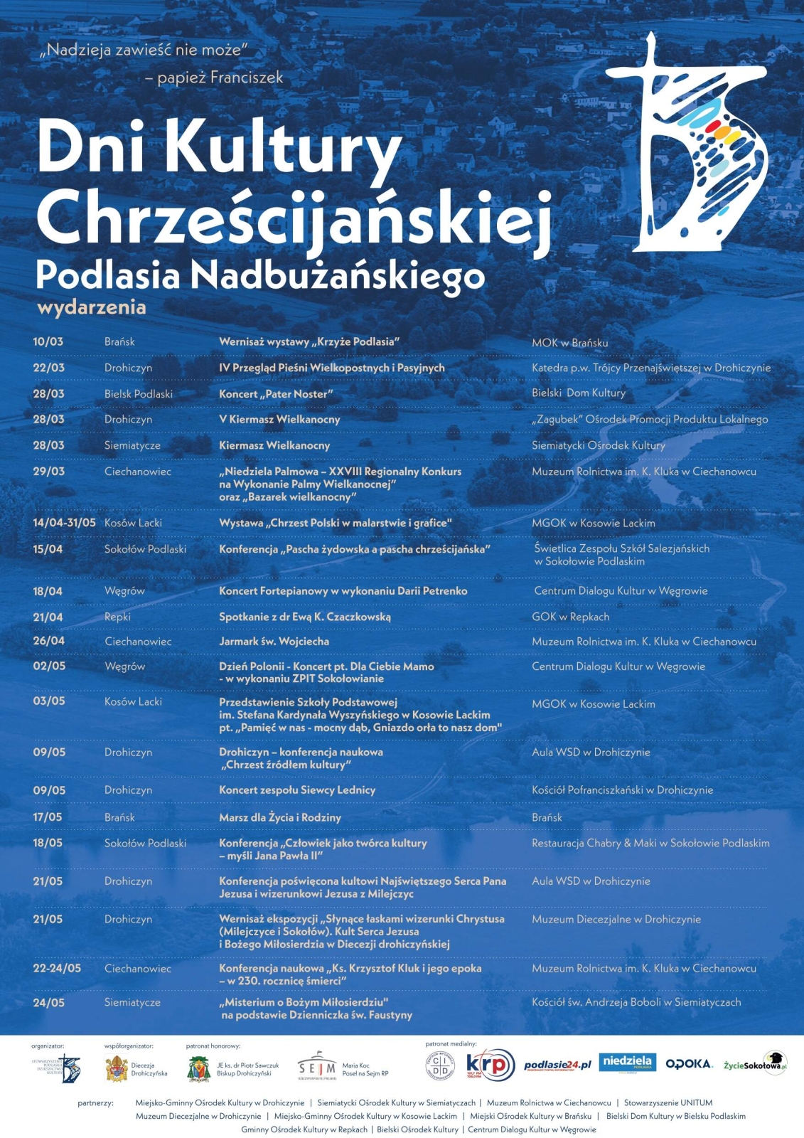 Warto podkreślić, że wydarzeniom organizowanym w Ciechanowcu towarzyszyć będą również liczne koncerty, wystawy, spotkania i konferencje odbywające się w innych miejscowościach Podlasia Nadbużańskiego. W programie znalazły się między innymi koncert zespołu Siewcy Lednicy w Drohiczynie, Marsz dla Życia i Rodziny w Brańsku, konferencje poświęcone kulturze chrześcijańskiej, spotkania autorskie oraz kiermasze wielkanocne.