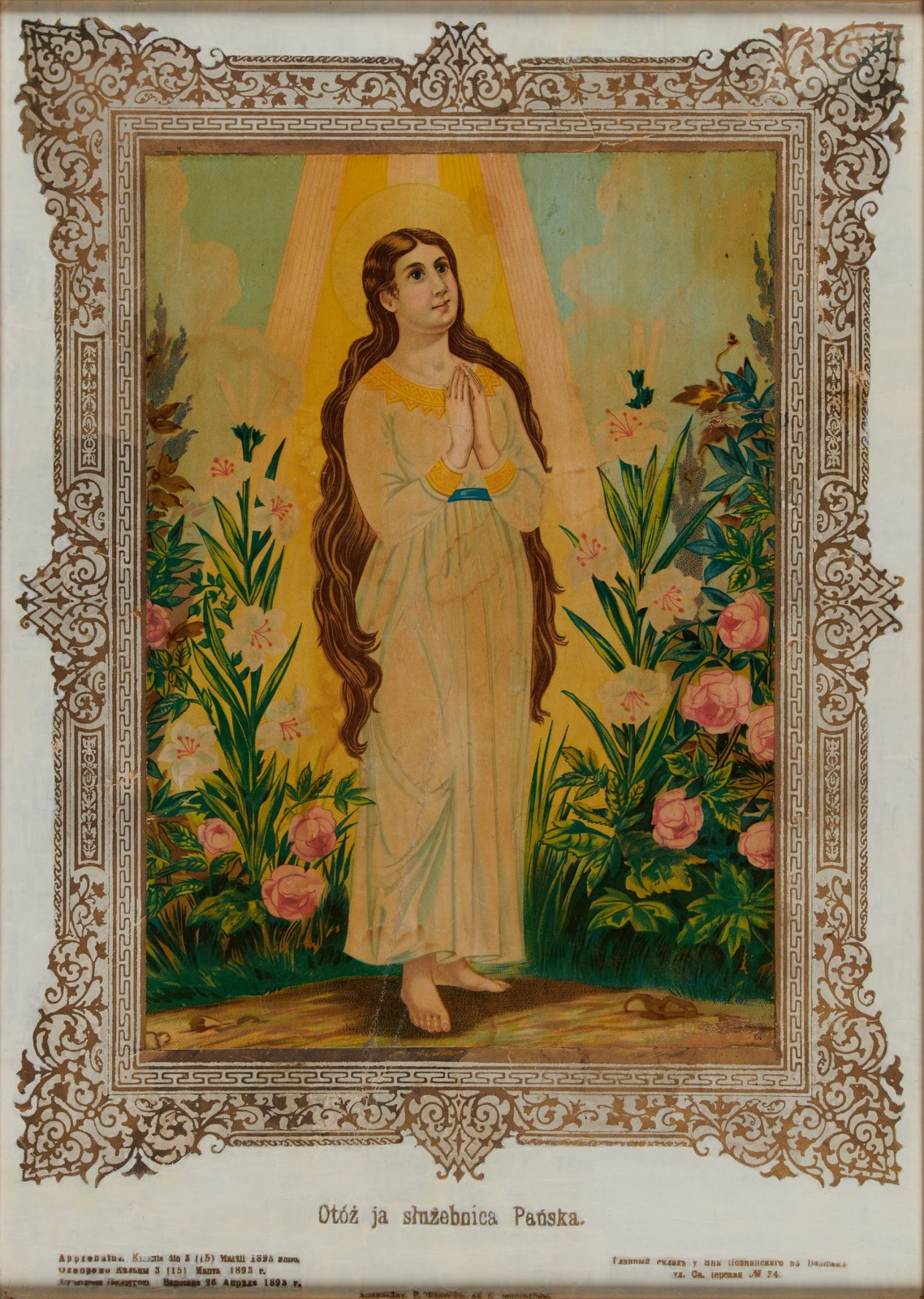 W kolekcji oleodruków Muzeum Rolnictwa znajduje się niezbyt często widywany, ale bardzo wdzięczny wizerunek Maryi. Jest na nim przedstawiona jako młodziutka dziewczyna o długich, rozpuszczonych włosach, stojąca boso wśród kwitnących kwiatów. Jej ręce złożone są do modlitwy, twarz ma pogodną, natchnioną, wokół głowy lśni aureola. Promienie światła spowijają całą tę uroczą postać, a bujna roślinność wokół zdaje się z Jej życiodajnej światłości czerpać swoją witalność. Podpis zamieszczony pod obrazkiem nie pozostawia wątpliwości, co to za wizerunek. „Otóż ja służebnica Pańska” to słowa, które wg Ewangelii św. Łukasza wypowiedziała Maryja podczas Zwiastowania (Łk 1, 38).