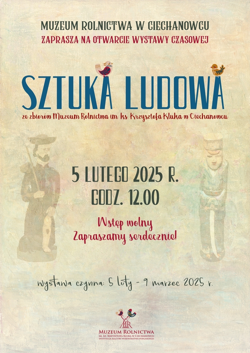 Zapraszamy na otwarcie wystawy czasowej „Sztuka ludowa ze zbiorów Muzeum Rolnictwa im. ks. Krzysztofa Kluka w Ciechanowcu”, które odbędzie się 5 lutego 2025 r. (środa) o godz. 12:00 w siedzibie głównej Muzeum przy ul. Pałacowej 5.
