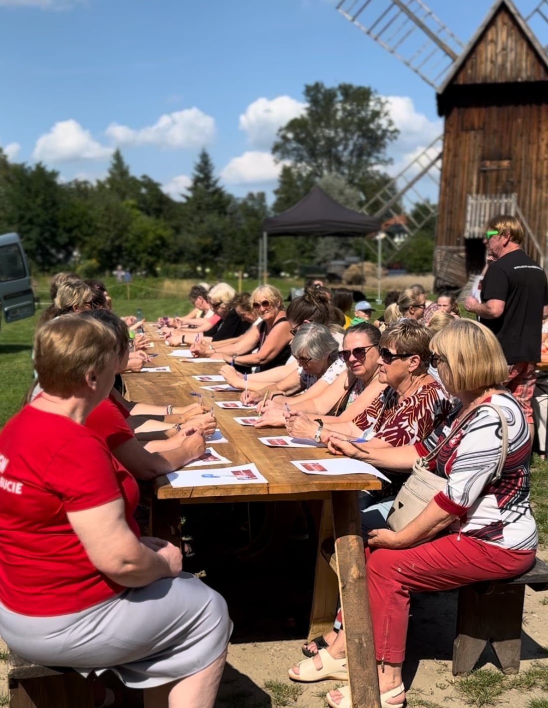 Na warsztaty, które rozpoczęły się punktualnie o godzinie 14:00, zaproszono (telefonicznie) członkinie Kół Gospodyń Wiejskich, młodzież z lokalnego koła teatralnego oraz seniorów, w tym również osoby z ograniczeniami ruchowymi, dla których organizatorzy zapewnili odpowiednie udogodnienia. Spotkanie rozpoczęło się od fascynującej opowieści Mistrza Piekarza. Pan Zbigniew Derewońko szczegółowo omówił cały proces wypieku – od doboru odpowiednich, tradycyjnych rodzajów mąki, przez specyfikę różnych typów pieców, aż po tajniki przygotowania ciasta. Uczestnicy z uwagą śledzili poszczególne etapy – od tworzenia zaczynu, dowiadując się, co należy do niego dodawać i na co zwracać szczególną uwagę, po finalne przygotowanie i wyrabianie ciasta. Wyrób zwieńczyło włożenie pachnącego ciasta, umieszczonego w blaszkach uprzednio wysmarowanych smalcem, do gorącego, rozgrzanego pieca. Podczas gdy chleb się wypiekał, uczestnicy mieli czas na sporządzenie notatek przy przygotowanych stołach. Pan Zbigniew chętnie służył radą i udzielał dodatkowych informacji, odpowiadając na liczne pytania. Aby wypełnić czas oczekiwania, zebrani udali się na krótkie, ale interesujące zwiedzanie. Mieli okazję zapoznać się z wystawą młynarstwa oraz ekspozycją poświęconą lokalnemu piekarnictwu, co stanowiło doskonałe uzupełnienie wiedzy zdobytej podczas warsztatów.