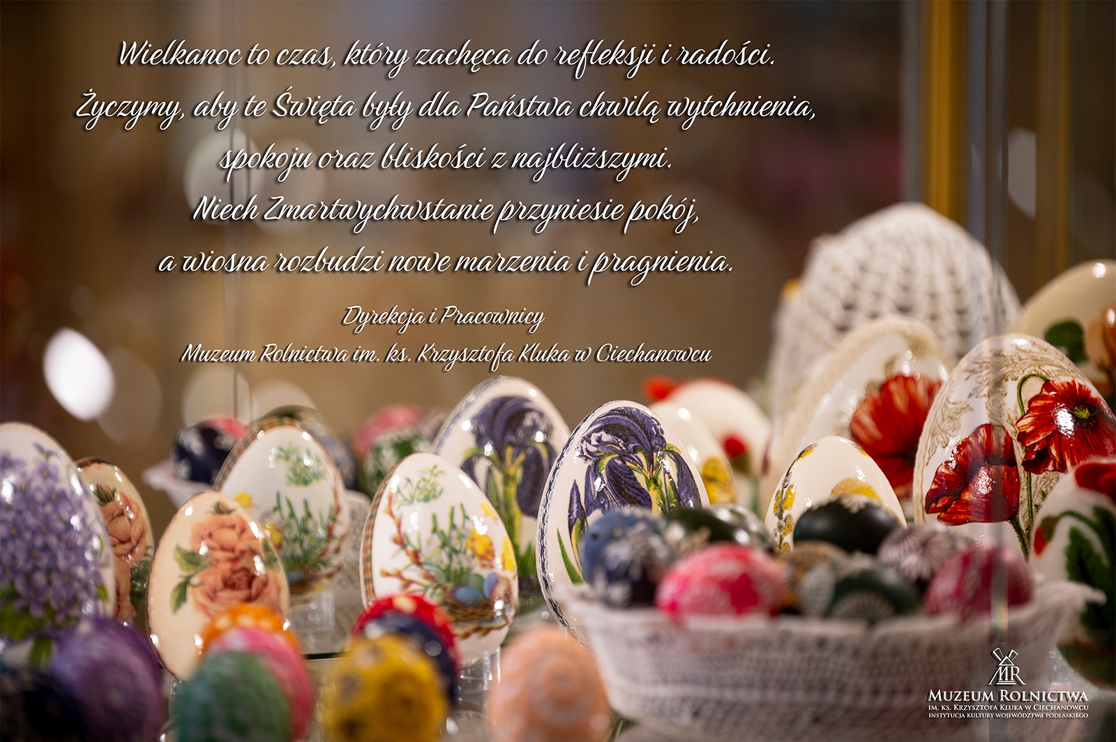W tle grafiki znajduje się zdjęcie przedstawiające grupę ozdobnych pisanek wielkanocnych. Jajka są bogato zdobione kolorowymi motywami kwiatowymi, m.in. czerwonymi makami i fioletowymi irysami. Część z nich ułożona jest w białym, ażurowym koszyczku. Tło jest nieostre, w ciepłych, brązowo-złotych barwach. W prawym dolnym rogu widnieje logotyp Muzeum Rolnictwa.