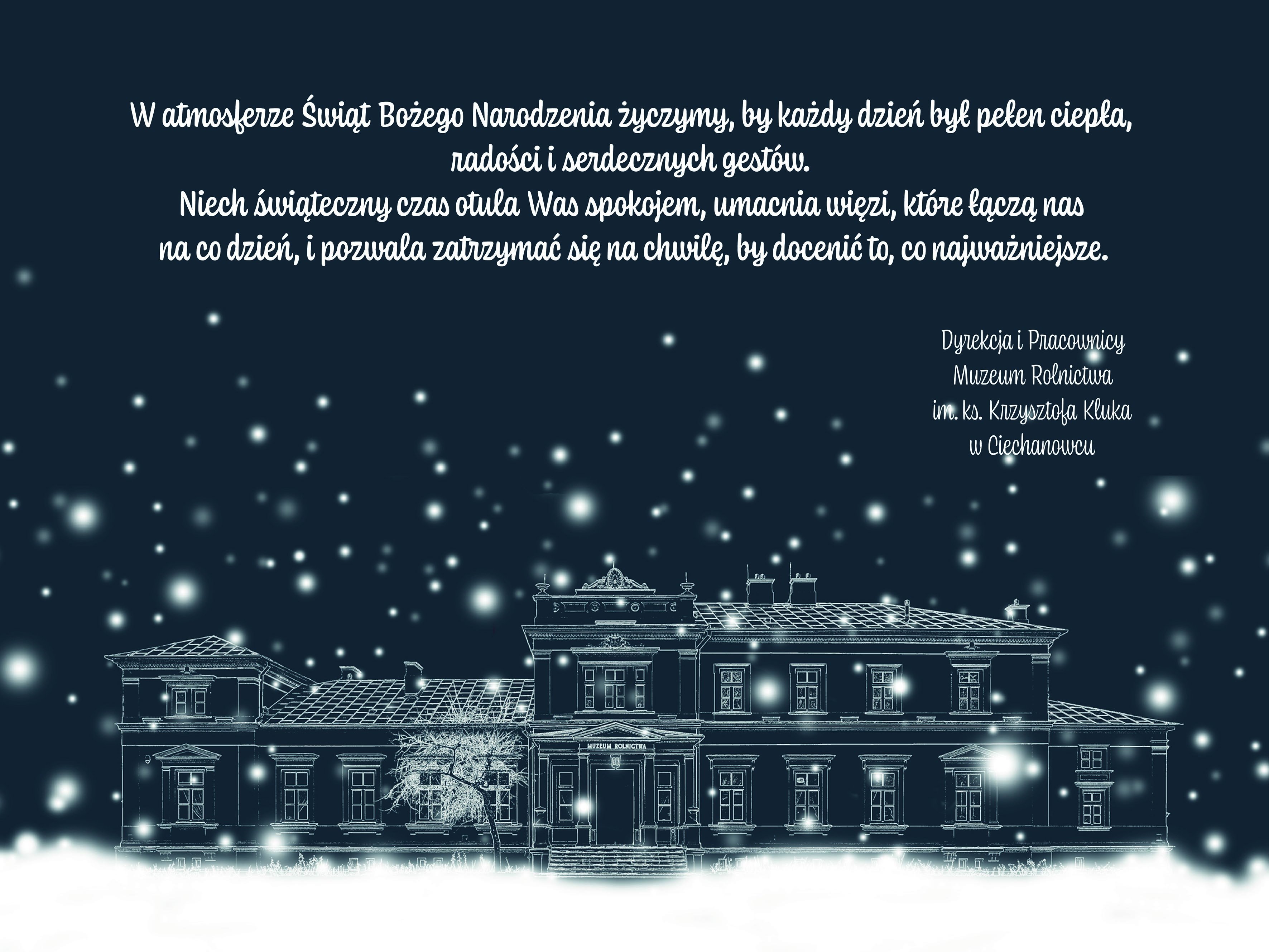 W magicznym czasie Świąt Bożego Narodzenia pragniemy złożyć wszystkim najserdeczniejsze życzenia. Niech te wyjątkowe dni będą wypełnione radością, miłością oraz spokojem, spędzonymi w gronie najbliższych. Z całego serca dziękujemy za wsparcie i zaangażowanie w mijającym roku. To dzięki Wam Muzeum Rolnictwa im. ks. Krzysztofa Kluka w Ciechanowcu może nieustannie rozwijać się i pielęgnować historię oraz tradycję i kulturę ludową. Życzymy zdrowia, ciepła i spełnienia marzeń w nadchodzących dniach oraz pomyślności w Nowym Roku.