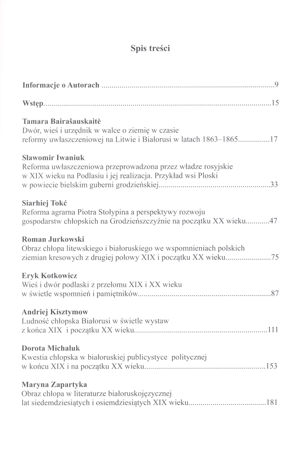 Publikacja zawiera dwadzieścia jeden rozdziałów. Są to teksty omawiające kwestie związane m.in. ze zmianami społecznymi, tożsamościowymi i gospodarczymi wsi w II połowie XIX i na początku XX w. jako skutków zniesienia poddaństwa i uwłaszczenia chłopów. Autorzy przedstawili zagadnienia dotyczące środowisk chłopskich, które tworzą obraz społeczności z różnych państw ówczesnej Europy: Austrii (Austro-Węgier), Prus (Niemiec) i Rosji.