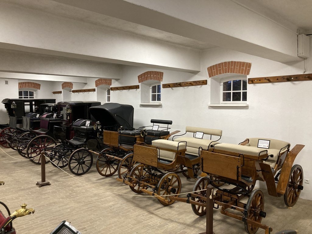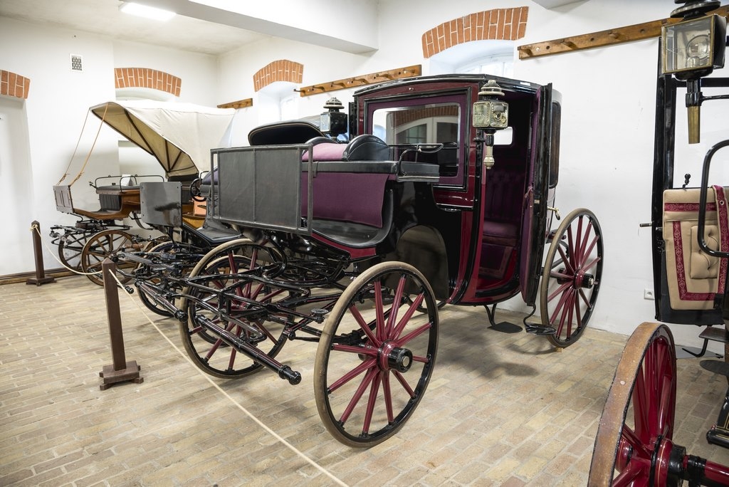 Na wystawie zgromadzono zabytkowe powozy konne i pojazdy zaprzęgowe z XIX i XX w. Na szczególną uwagę zasługują dwie luksusowe karety typu coupé, kareta fiakierska (plauka) oraz powóz typu milord. Ekspozycję uzupełniają przykłady sań oraz wozów gospodarskich, takich jak bryczki i wasągi, ukazujące codzienne wykorzystanie transportu konnego na dawnej wsi.