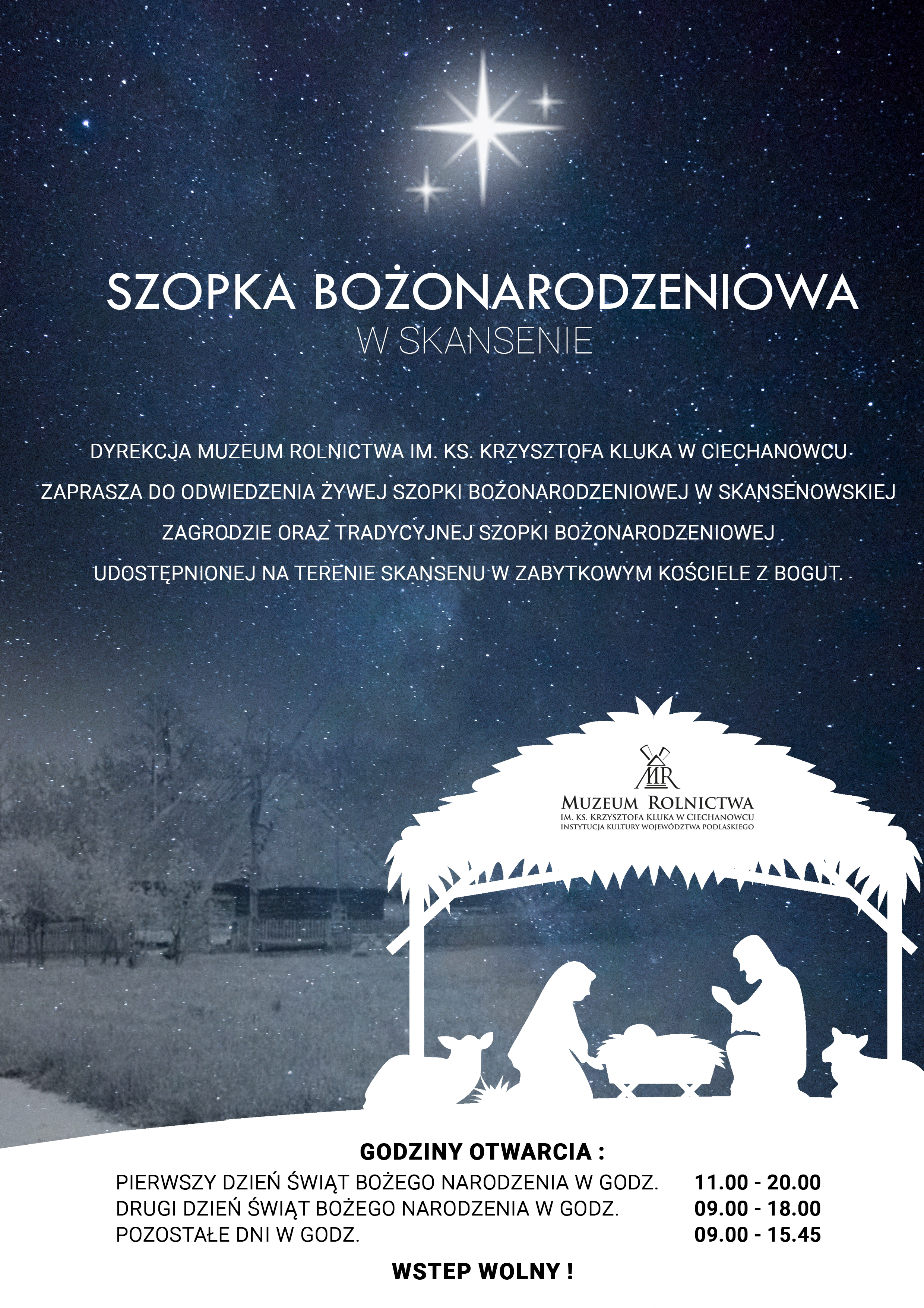 Dyrekcja Muzeum Rolnictwa im. ks. Krzysztofa Kluka w Ciechanowcu zaprasza do odwiedzenia żywej szopki bożonarodzeniowej w skansenowskiej zagrodzie oraz tradycyjnej szopki bożonarodzeniowej udostępnionej na terenie skansenu w zabytkowym kościele z Bogut.