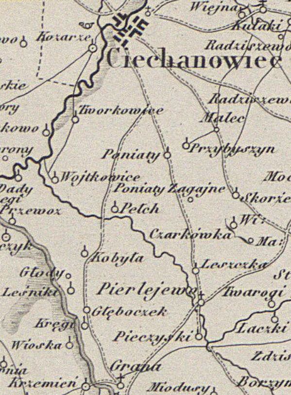 „na chłopskie pegazy, które rączo uniosły nas przez Gródek, posiadający starożytne w pobliżu wały, przez Granne , gdzie Bug na promie przebyliśmy, przez wieś Pełch, gdzie nad rzeczką tegoż nazwiska były niewątpliwie starożytne osady, przez Ciechanowiec z pomnikiem księdza Kluka i wieżą z bramy zamkowej Ossolińskich, a słynny jarmarkami na świętego Wojciecha — do Czyżewa”