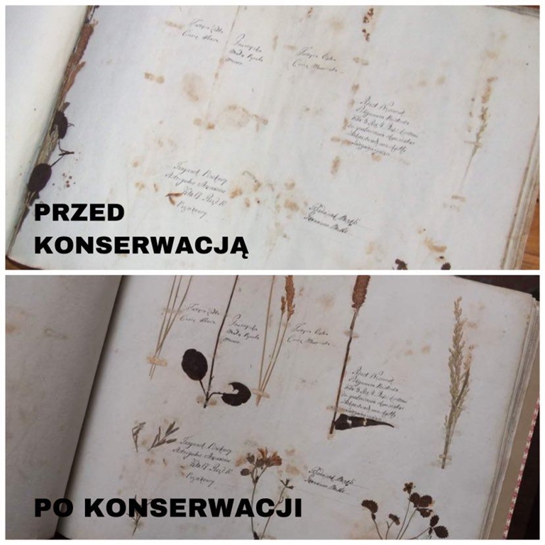 Na zamieszczonych fotografiach mogą Państwo zobaczyć zabytkowe, XIX-wieczne zielniki ze zbiorów Działu Tradycji Zielarskich naszego muzeum. Warto zwrócić uwagę na zbawienny wpływ konserwacji na stan zachowania jednego z nich.
