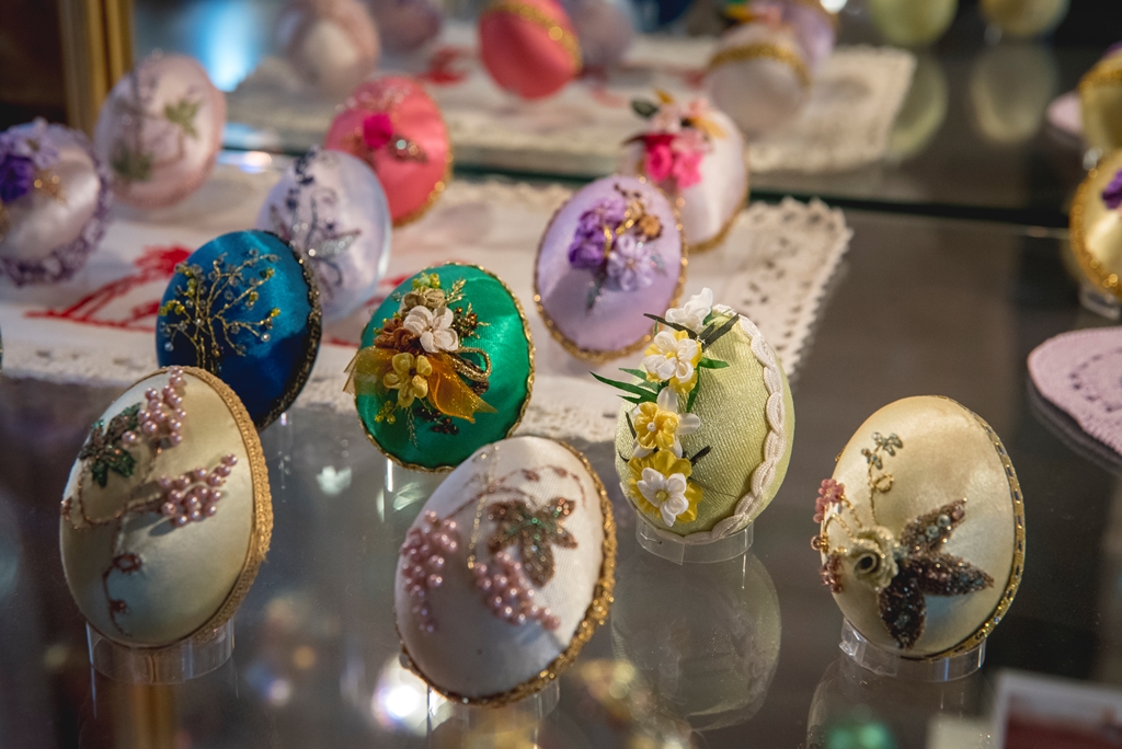 - techniką aplikacyjną – która polega na oklejaniu wydmuszek, co z kolei daje możliwość puszczenia wodzy fantazji, czego efekty doskonale widać w muzeum. Wydmuszki są oklejone tradycyjnie kolorowym, błyszczącym papierem, świecidełkami, czy też koralikami. Jednak są i takie, które zaskakują. Niektóre jajka oklejone są sitowiem i przędzą, ale również przeróżnymi ziarnami, np. ryżu, gryki lub nasionami ogórków;