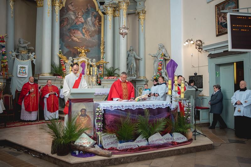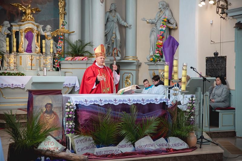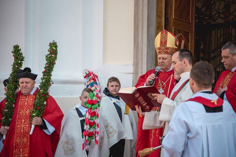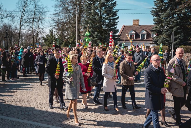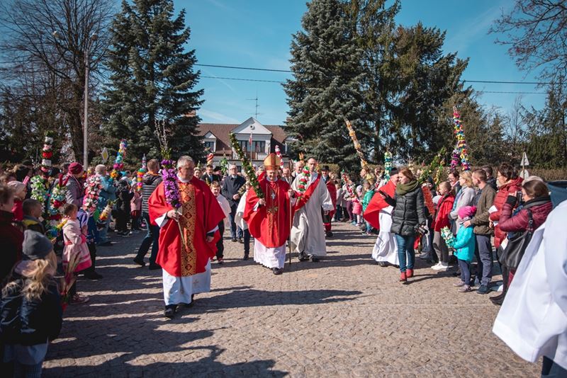 Uroczystość Niedzieli Palmowej pod Patronatem Duchowym Jego Ekscelencji Księdza Biskupa Tadeusza Pikusa Ordynariusza Diecezji Drohiczyńskiej stała się już tradycją w ciechanowieckiej parafii pw. Trójcy Przenajświętszej w Ciechanowcu. Ten dzień był jednocześnie zakończeniem i podsumowaniem XXII Konkursu na Wykonanie Palmy Wielkanocnej, organizowanego przez Muzeum Rolnictwa im. ks. Krzysztofa Kluka w Ciechanowcu, Starostwo Powiatowe w Wysokiem Mazowieckiem oraz Parafię pw. Trójcy Przenajświętszej w Ciechanowcu. O godz. 9.30 uczestnicy konkursu ze swoimi palmami przywitali przed plebanią gości oraz JE Księdza Biskupa, który poprowadził uroczystą procesję Niedzieli Palmowej do kościoła na Mszę Świętą i poświęcił wszystkie palmy.