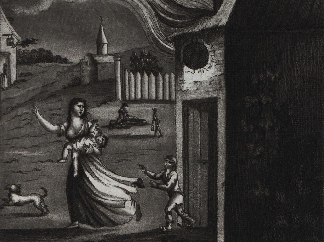 ryc. Kobieta z dzieckiem na ręku i chłopczyk uciekający z płonącego domu, Biblioteka Narodowa, sygn. G.69020/I.