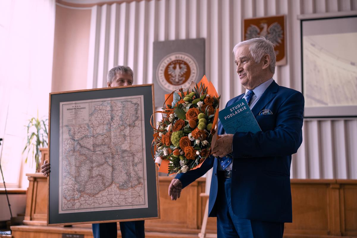 Wydarzenie odbyło się w czwartek (27.04) na Auli Wydziału Historii i Stosunków Międzynarodowych Uniwersytetu w Białymstoku. W uroczystości wzięli udział członkowie władz uczelni z rektorem prof. dr hab. Robertem Ciborowskim na czele, dziekani, prodziekani, szefowie podlaskich (i nie tylko) instytucji kulturalnych i historycznych, towarzystw naukowych, zarządu głównego Związku Inwalidów Wojennych RP, białostockich szkół i uczelni wyższych, a także przedstawiciele podlaskich władz, w tym wojewoda podlaski Bohdan Paszkowski, wicemarszałek Wiesława Burnos, zastępca prezydenta Białegostoku Rafał Rudnicki.