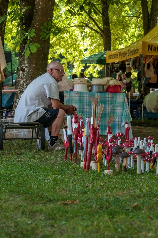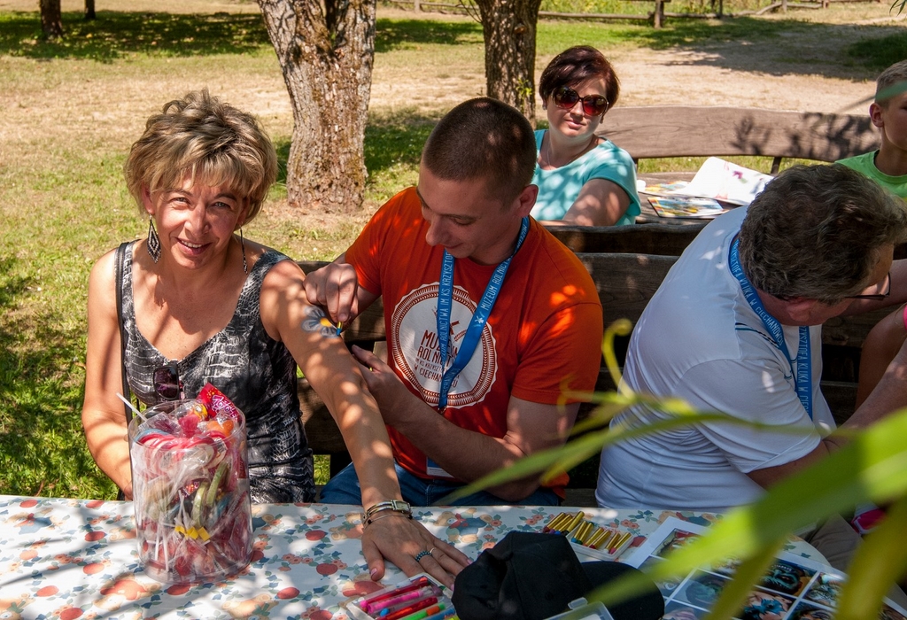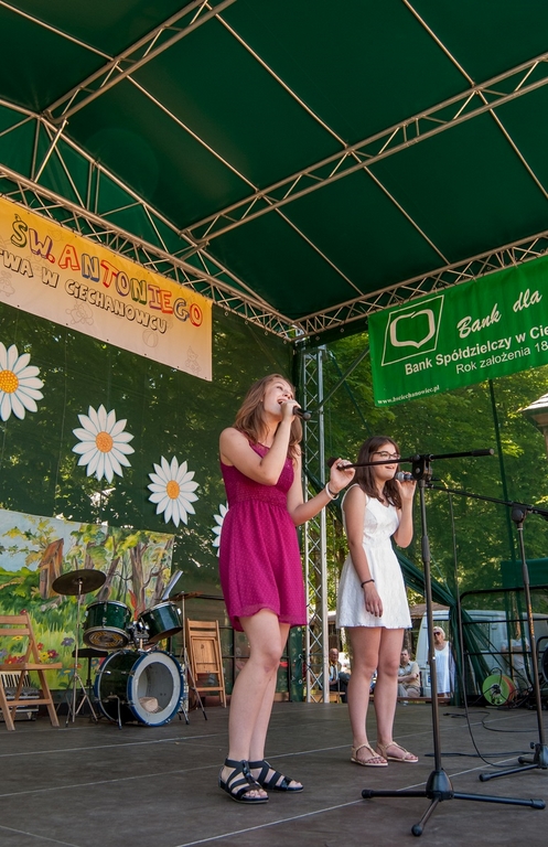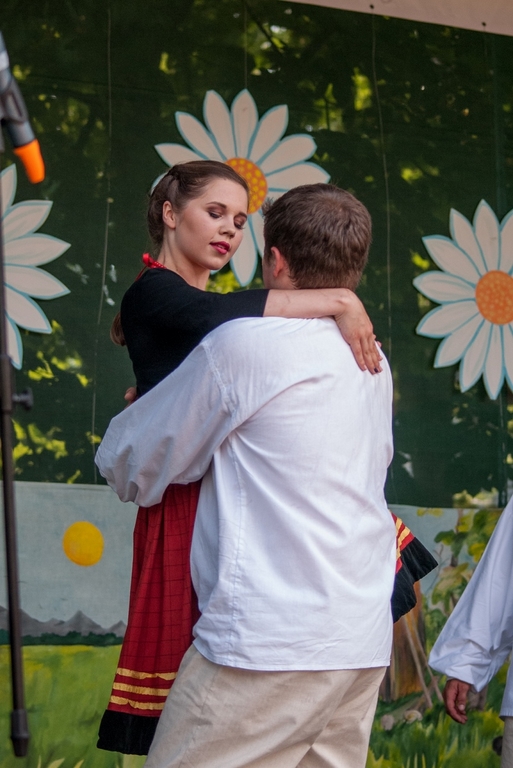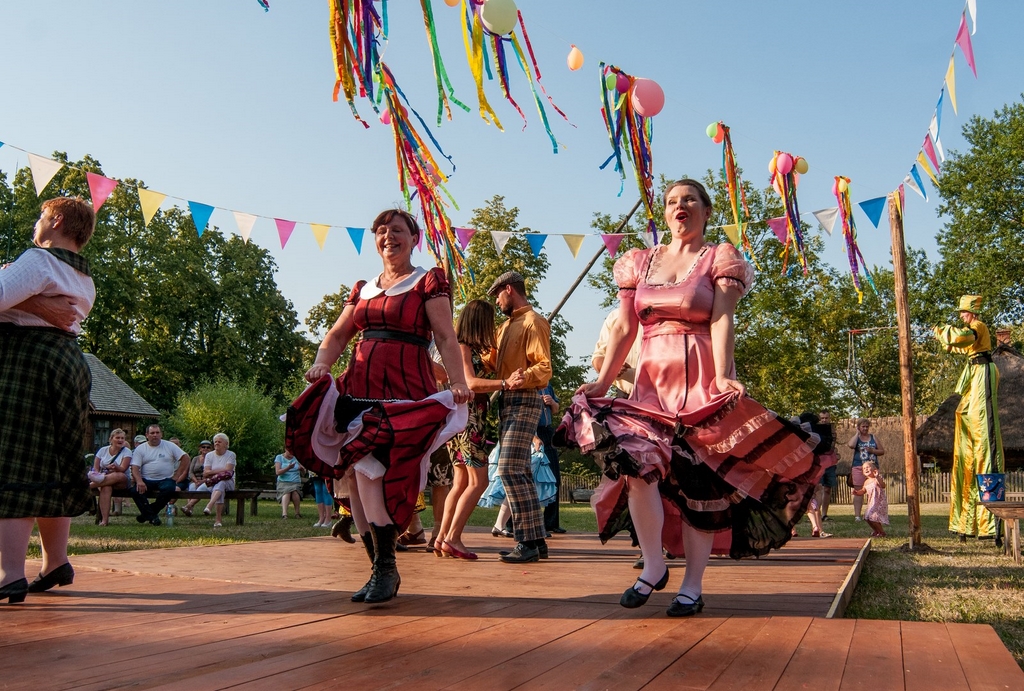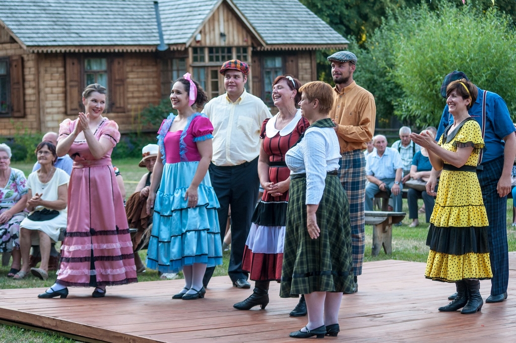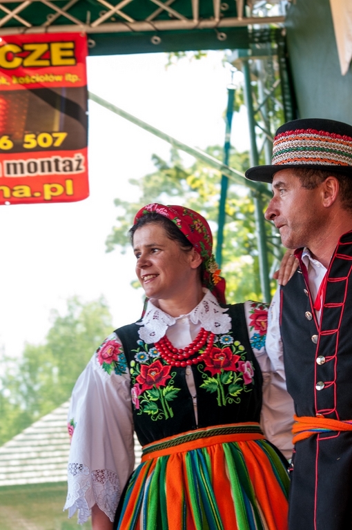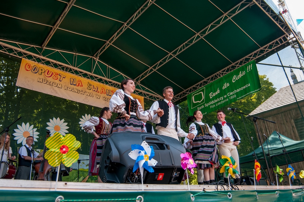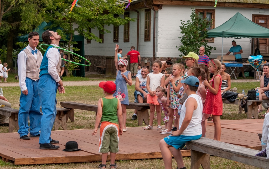 W niedzielę, 5 lipca, po raz trzeci odbył się w naszym skansenie Odpust, który nawiązuje do uroczystości obchodzonej w macierzystej parafii naszego muzealnego, zabytkowego kościola - Bogutach Piankach. To niezwykle barwne i wyjątkowo w tym roku upalne wydarzenie przyciągnęło prawie 5 tys. Turystów. Od rana skansenowska wieś zapełniła się gwarem i muzyką, a wszyscy przybyli goście przez cały dzień korzystali z licznych atrakcji odpustowych, zatracając się w magii tego zaczarowanego święta. Jak za dawnych lat teren przykościelny zapełniły liczne stragany z dewocjonaliami, łakociami i zabawkami oraz popisy kuglarzy i szczudlarzy oraz muzyka z katarynek i zapach waty cukrowej przyciągały jak magnes najmłodszych uczestników wydarzenia. Jak każdy odpust wiejski - impreza była rajem dla dzieci. Gazon przez pałacem zamienił się w plac zabaw z karuzelą i dmuchanymi zjeżdżalniami. W jednej z chłopskich zagród rodzice z dziećmi mogli zmierzyć się w licznych konkursach i zabawach m.in.: bieganiu w workach, rzucaniu do piramidy puszek, gry w gumę czy toczeniu fajerek. Chaty skansenowskie znów "ożyły", a we wnętrzach prezentowano dawne prace domowe i rzemiosła m.in. tkanie na krosnach, wyplatanie koszyków, odwirowywanie śmietany w centryfudze oraz wyrób masła w ręcznej maselnicy. Jak zwykle można było posmakować naszych regionalnych specjałów - piwa jałowcowego, placków ziemniaczanych, naparów ziołowych, chleba ze smalcem lub masłem, podpłomyków. Oprócz uczty dla ciała, było wiele atrakcji dla ducha. Do bajkowego świata w spektaklu "Prot i Filip" wszystkie dzieci porwał Teatr OdSkocznia. Program na scenie wypelniły występy zespołów dziecięcych, młodzieżowych oraz ludowych. Dzieci z Przedszkola im. Kubusia Puchatka w Szepietowie zaprezentowały tańce narodowe, m.in. krakowiaka. Natomiast milusińscy z przedszkola w Ciechanowcu wystąpili w przedstawieniu p.t. "Czerwony Kapturek". Młodzież z ciechanowieckiego Gimnazjum zaprezentowała skecz kabaretowy oraz piosenki z konkursu angielskiej poezji śpiewanej. Śpiewak ludowy z Kurpi - Henryk Kulesza, - człowiek bezgranicznie przywiązany do tradycji ludowej zaśpiewał pieśń o Św. Antonim - patronie naszego kościoła oraz osób i rzeczy zaginionych. Repertuar w wykonaniu Kapeli Kłosy, Podlaskich Kukułek z Bielska Podlaskiego, Kurpiowskich Meandrów z Łomży oraz Zespołu BezWianka z Ostrowi Mazowieckiej przypomniał utwory, którymi niegdyś rozbrzmiewały wiejskie domy i podwórka. Na zakończenie odpustu w trakcie koncertu Warszawskiej Kapeli z Targówka zespół BezWianka zaprezentował widowiskowe Tańce Starej Warszawy, porywając wszystkich do tańca. Tak rozpoczęła się odpustowa potańcówka na dechach, którą poprowadzil Krzysztof Koc ze swoim zespołem.