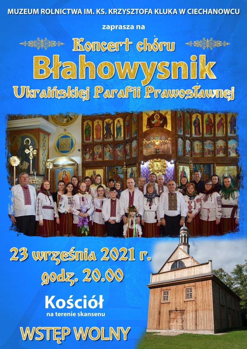 23 września 2021 r. (czwartek) zapraszamy do MUZEUM ROLNICTWA IM. KSIĘDZA KRZYSZTOFA KLUKA W CIECHANOWCU na koncert chóru "Błahowysnik" Ukraińskiej Parafii Prawosławnej. Występ odbędzie się o godz. 20.00 w kościółku na terenie skansenu. Wstęp wolny.