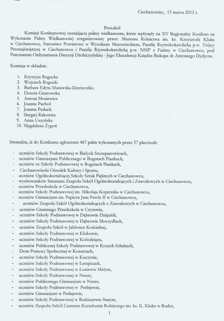 Zbiórka uczestników Konkursu z palmami w dniu 1 kwietnia (w niedzielę) o godz. 9.30 na placu przed plebanią kościoła pw. Trójcy Przenajświętszej. Poniżej protokół z obrad jury oraz wykaz nagrodzonych uczestników.